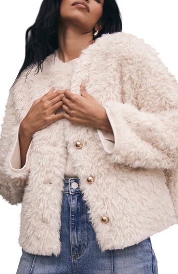 Neutral faux fur jacket featuring a crew neckline, long sleeves with gold-tone button fastenings through the front.