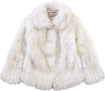 Luxury sparkle faux fur jacket dresses up any outfit. Silver metallic yarns accent winter white faux fur. Satin lining.