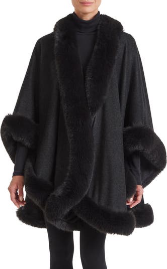 Take the avenue in the refined style of this voluminous cashmere cape finished perfectly with plush faux fur.