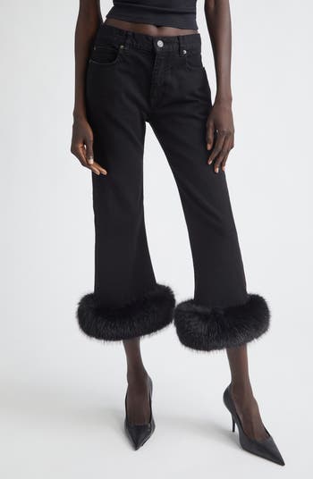 Plush faux fur rings the cropped hems of these stretchy Japanese-denim flare jeans featured in the 'Exactitudes' lookbook, which celebrates the end of an era for creative director Demna's sartorial archetypes.