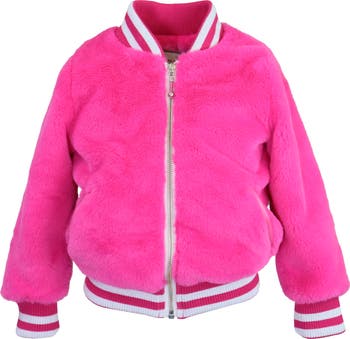 Faux fur varsity jacket is soft and sporty. Rib trim and zipper closure make this style easy to wear.