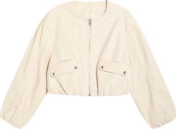 Bring a layer of effortless cool to any after-hours outfit in a collarless, cropped bomber jacket finished with a smooth faux leather coating and glinting metal hardware for a sleek, moto-inspired vibe.