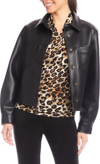 Realistic faux leather with a sleek finish adds instant edge to this jacket imbued with moto-inspired charm.