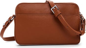 A boldly embossed logo brings a signature touch to this slender crossbody made from sleek faux leather and suspended from an adjustable strap for versatile styling.