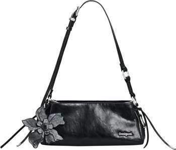 A charming floral appliqué adds stylish whimsy to this faux-leather bag featuring a ruched top handle and adjustable crossbody strap for versatile carry.