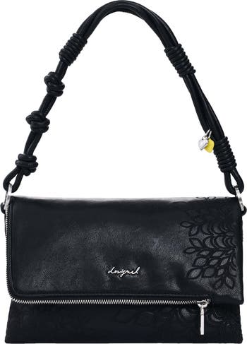 Signature logo hardware and a floral embroidery add stylish whimsy to a faux-leather bag featuring a knotted shoulder strap and adjustable crossbody strap for versatile carry.