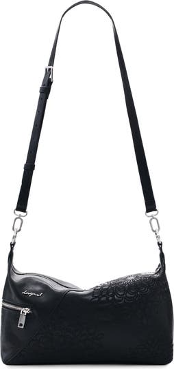 An exterior zip pocket and floral embroidery bring whimsical dimension to a slouchy faux-leather shoulder bag featuring a pair of optional straps for versatile wear.