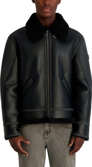 A sleek take on cold-weather layering, this midweight bomber jacket pairs the sophisticated look of faux leather with the plush warmth of a faux shearling lining and collar. Clean lines and utilitarian details give it an edge, while the soft interior adds refined comfort.