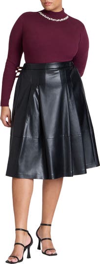 A pull-on faux-leather midi with front pleats and a softly structured silhouette.