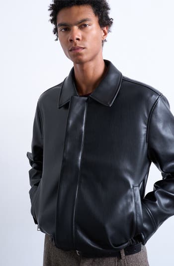 A streamlined silhouette defines this faux leather jacket designed with a hidden front-zip closure and zippered cuffs that add a subtle, utilitarian edge.