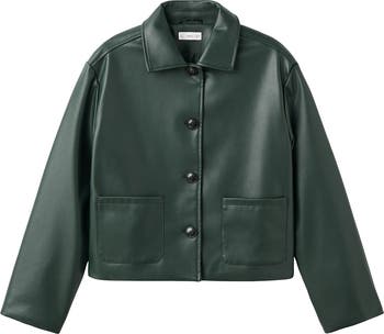 Sleek faux leather amps up the edge of this closet-essential jacket updated in a sleek green colorway and fronted with patch pockets.