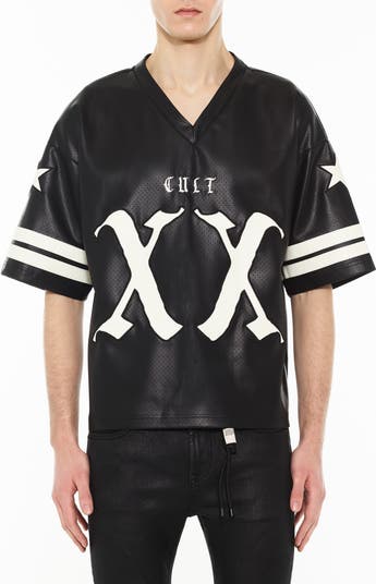 The classic sports jersey hits the streets with this perforated faux-leather version that adds a bold edge to your look.