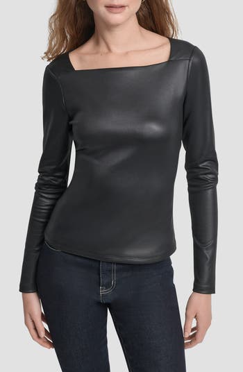 The leather is faux but the attitude is real in this square-neck top of glazed jersey that amps up your night-out look.
