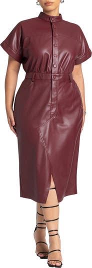A stretch faux-leather shirt dress with utility pockets and a refined calf-skimming skirt.