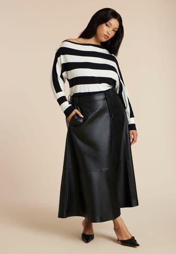 - Sleek shine & soft structure define this faux leather midi skirt—which comes complete with belt loops, topstitching, and functional pockets. Its subtle paneling and midi length create a clean, city-ready silhouette that pairs well with everything.