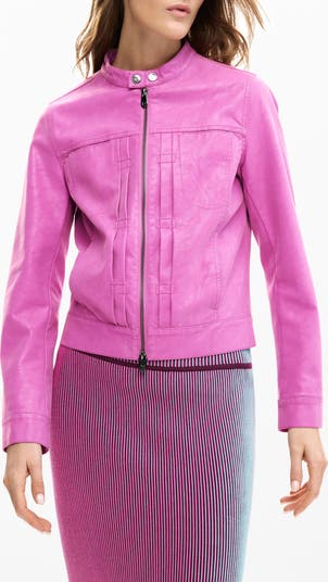 Crisp pleating puts a modern spin on this sleek faux-leather moto jacket.