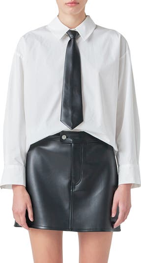 A faux-leather necktie hangs from the point collar of this crisp cotton button-up perfectly merging polished style with a hint of edge.