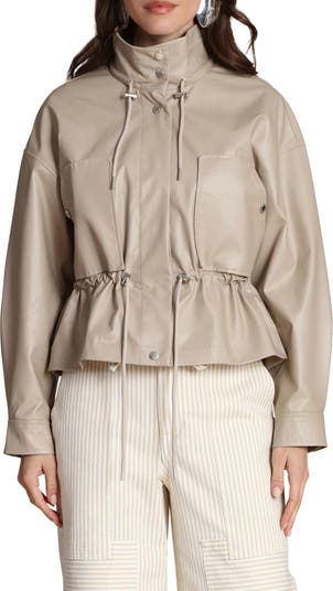 Drawcord toggles at the stand collar and waist bring modern utility to this faux-leather jacket finished with a flirty peplum hem and chest-patch pockets.