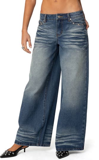 With faux-leather back pockets and silvery grommets, these low-rise jeans detailed with whiskering and fading are sure to stand out from the rest.