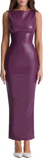 Plum-hued faux leather stands out on this edgy sheath designed with a corset-inspired bodice and breezy back vent.