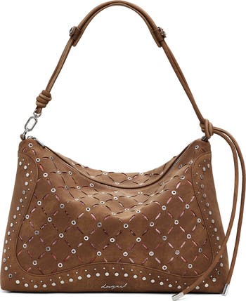 A floral-print lining peaks out from laser-cut perforations on a studded faux-leather shoulder bag featuring a roomy interior and pair of detachable straps for on-the-go versatility.