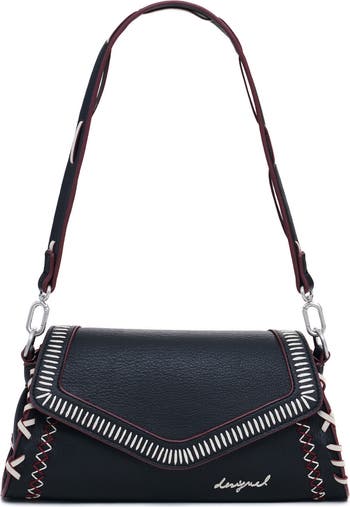 Contrast stitching highlights the structured silhouette of this faux-leather handbag furnished with dual straps that can be swapped out for optimal versatility.