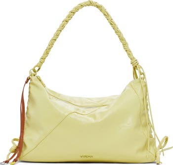 Bow-cinched side panels and contrasting tassels bring dimension to a slouchy shoulder bag featuring a vivid faux-leather exterior and optional crossbody strap for versatile wear.