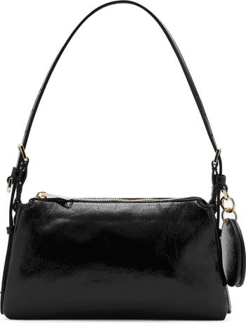 A removable mirror charm and '90s-inspired profile add to the on-the-go convenience of a faux-leather shoulder bag suspended from an adjustable strap.