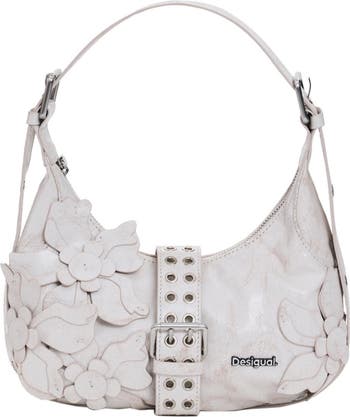 A grommet-accented strap and floral appliqués bring edge and whimsy to a perfectly sized bag suspended from an adjustable shoulder strap for convenient styling.