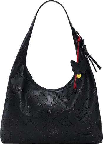 Whimsical charms and decorative perforations highlight the slouchy profile of a faux-leather shoulder bag designed with a spacious interior and multiple pockets to easily organize your daily items.