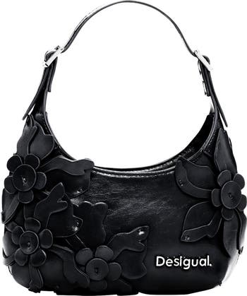 Signature logo hardware and tonal floral appliqués highlight the faux-leather exterior of a '90s-inspired bag featuring an versatile strap that adjusts for shoulder or crossbody wear.