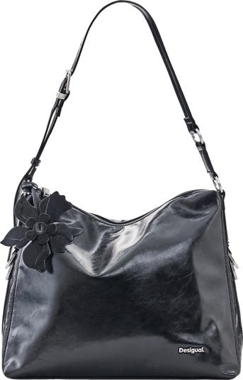 A detachable floral charm adds stylish whimsy to a spacious faux-leather shoulder bag featuring multiple pockets and an adjustable strap for on-the-go convenience.