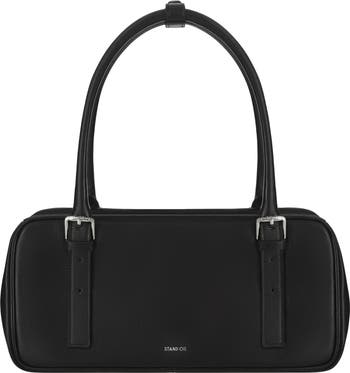 An squared bowling-inspired silhouette offers ample storage for the essentials in this faux-leather bag that makes an ideal accessory for daytime and casual outings.