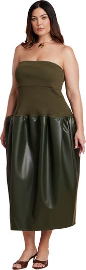 - Turn heads in this strapless drop-waist dress that blends a soft knit bodice with a faux leather skirt. A strapless neckline and modern silhouette blend contemporary contrast and styling ease.