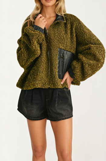 Chic meets edgy in this textured zip-up jacket from Knit & Lounge, featuring plush boucle fabric and striking faux leather contrast trims. The oversized silhouette is equal parts cozy and statement-making, while the asymmetrical zip pocket and vegan leather collar bring a polished and contemporary touch. A go-to layer for transitional temps and bold everyday looks.