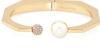 A faux pearl and pavé crystal ball bring eye-catching lustre to an angular statement-making cuff with a shiny goldtone plate.