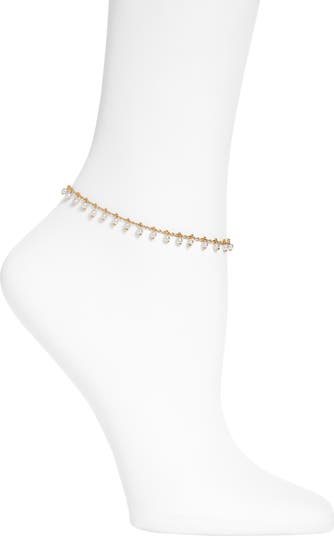 Lustrous faux pearls dangle from this handmade anklet adding elegant movement to each step.