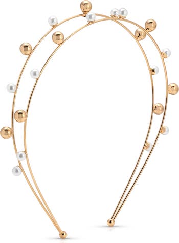 Add a glow to your hairstyle with this double headband adorned with faux pearls and golden bubbles that catch the light with every turn of your head.