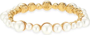 Mixed-scale faux pearls line this elegant bangle encircling it with lustrous dimension.