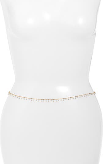 Center your look in shine with this 18-karat gold-plated belly chain strung with glowing faux pearls.