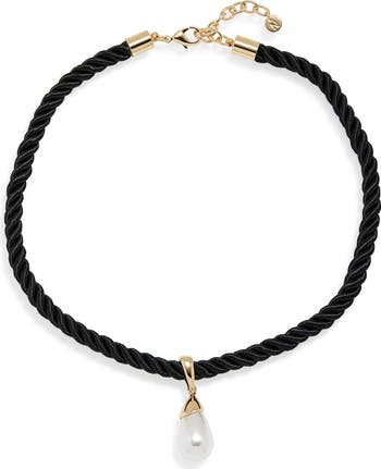 A lustrous faux pearl dangles at the front of this texture-rich corded necklace that nods to '90s style.
