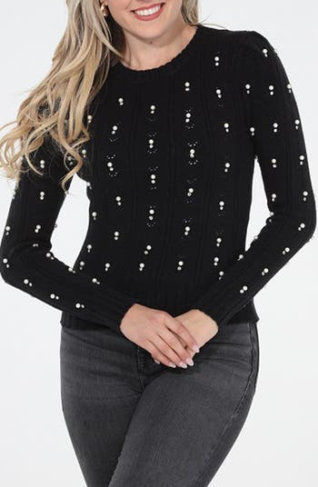 Faux pearls seem to drip down this lightweight cotton-blend sweater adorned by dimensional pointelle stitches.