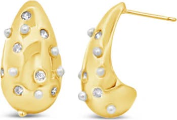 A sprinkling of crystals and faux pearls adds extra dimension to the sculptural teardrop silhouette of these golden earrings.
