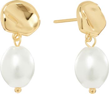 Lustrous faux pearls dangle from molten discs in these sculptural drop earrings that bring contemporary elegance to your look.