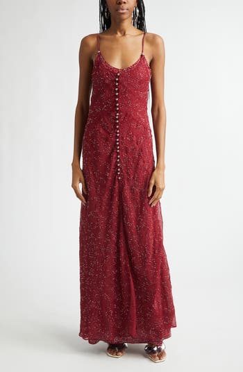Shimmering beadwork arranged in a fireworks-inspired motif animates this ankle-skimming dress made of filmy chiffon.