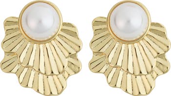 Fluted fans create radiating shine in vintage-inspired drop earrings glowing with faux pearls.