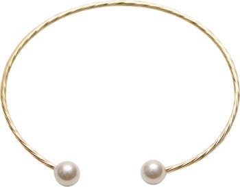 A twisted sterling silver band is punctuated with glossy faux pearls in this understated cuff.