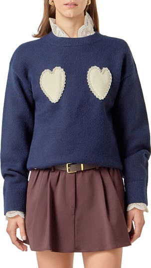 Just a little bit slouchy, this soft and lightweight crewneck sweater beguiles with twin hearts traced with glossy faux pearls and sparkling rhinestones.