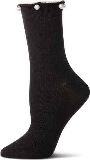 Lettuce-edge detailing and faux-pearl accents give an anklet-inspired look to the cuff of these supersweet crew socks.