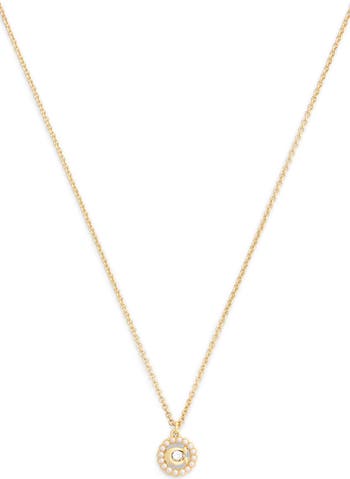 Elevate your everyday style with this dainty chain necklace complete with a golden logo pendant adorned with faux pearls and a center sparkling crystal.